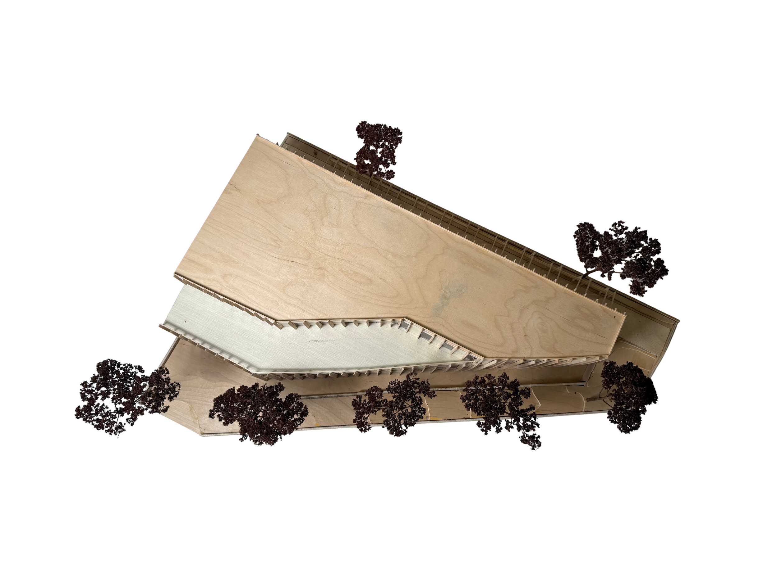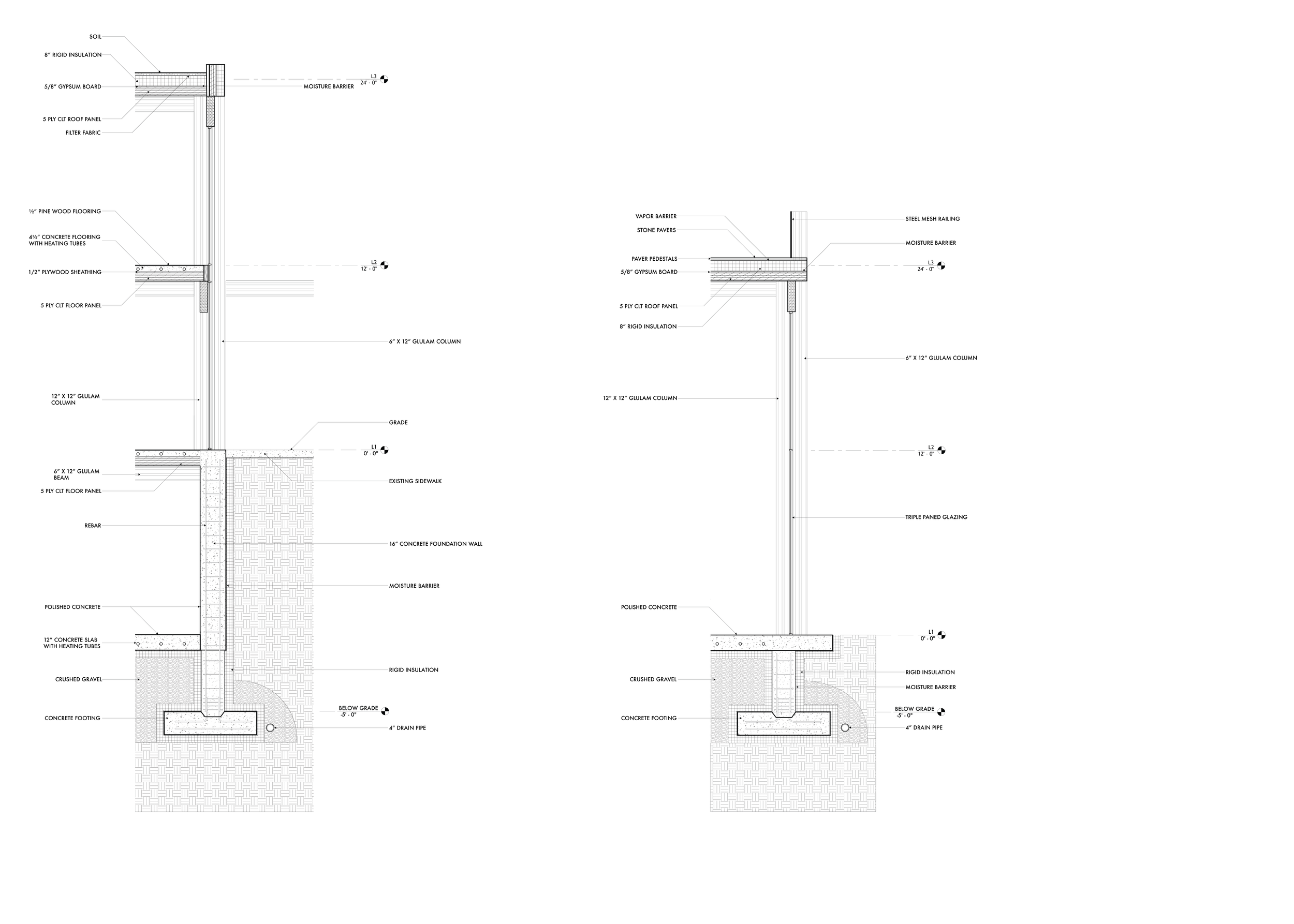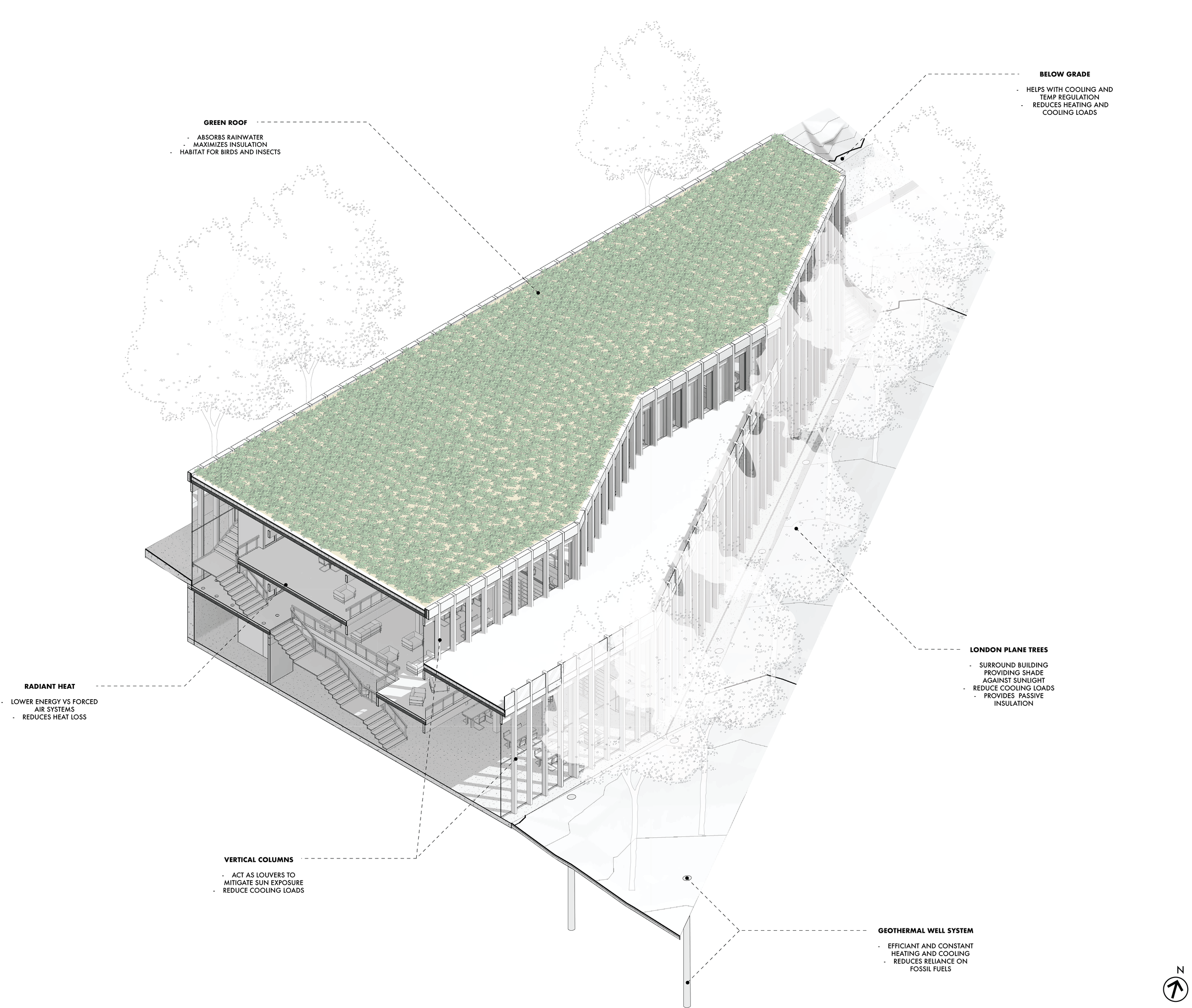 The combination of mass timber and large areas of glazing blend the border between inside and outside and take advantage of existing site elements including a border of mature London Plane trees, existing grade changes, and a well-used existing foot path on the western side. A sedum roof helps to minimize site impact and to replace the lawn lost to the footprint of the building.