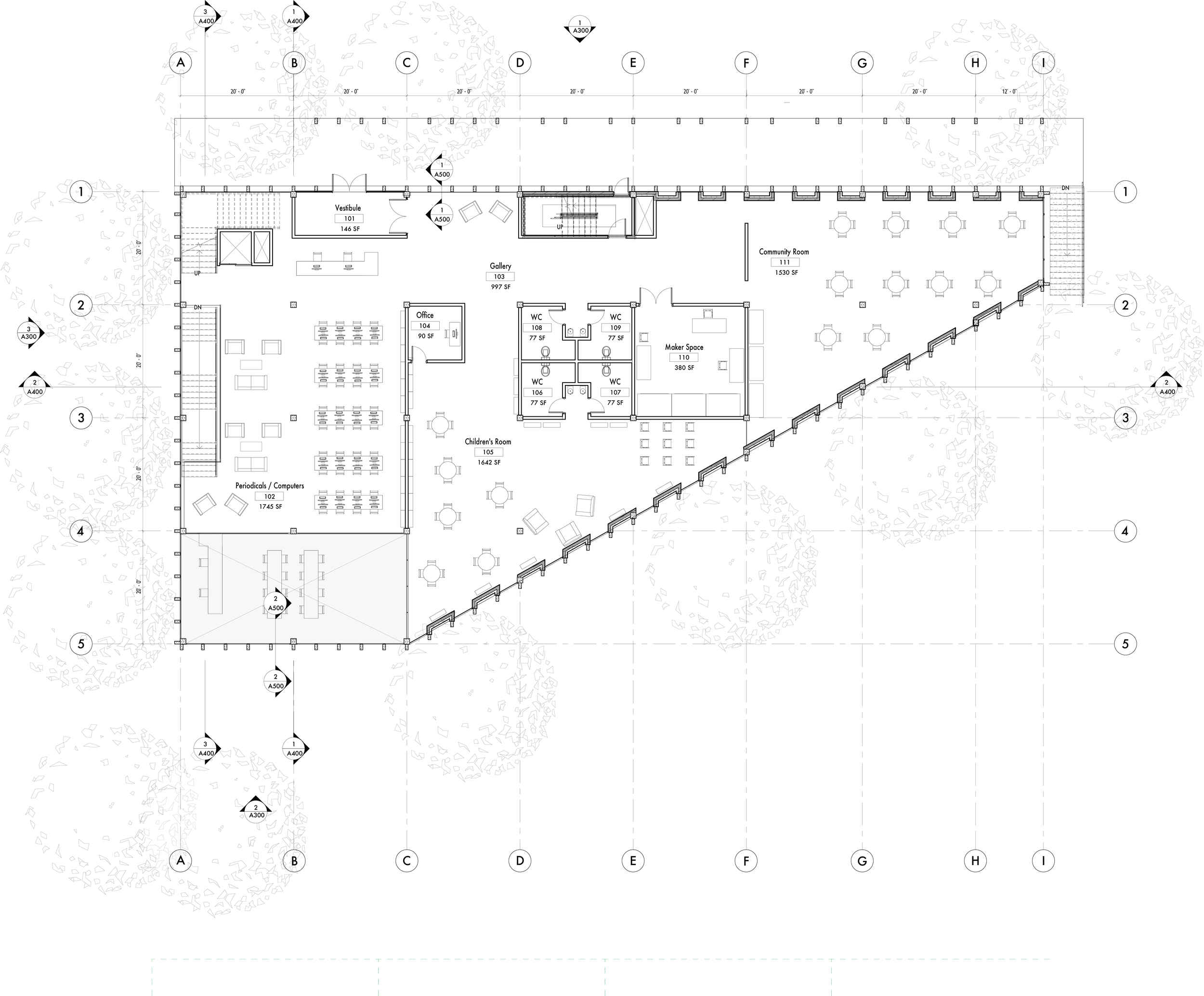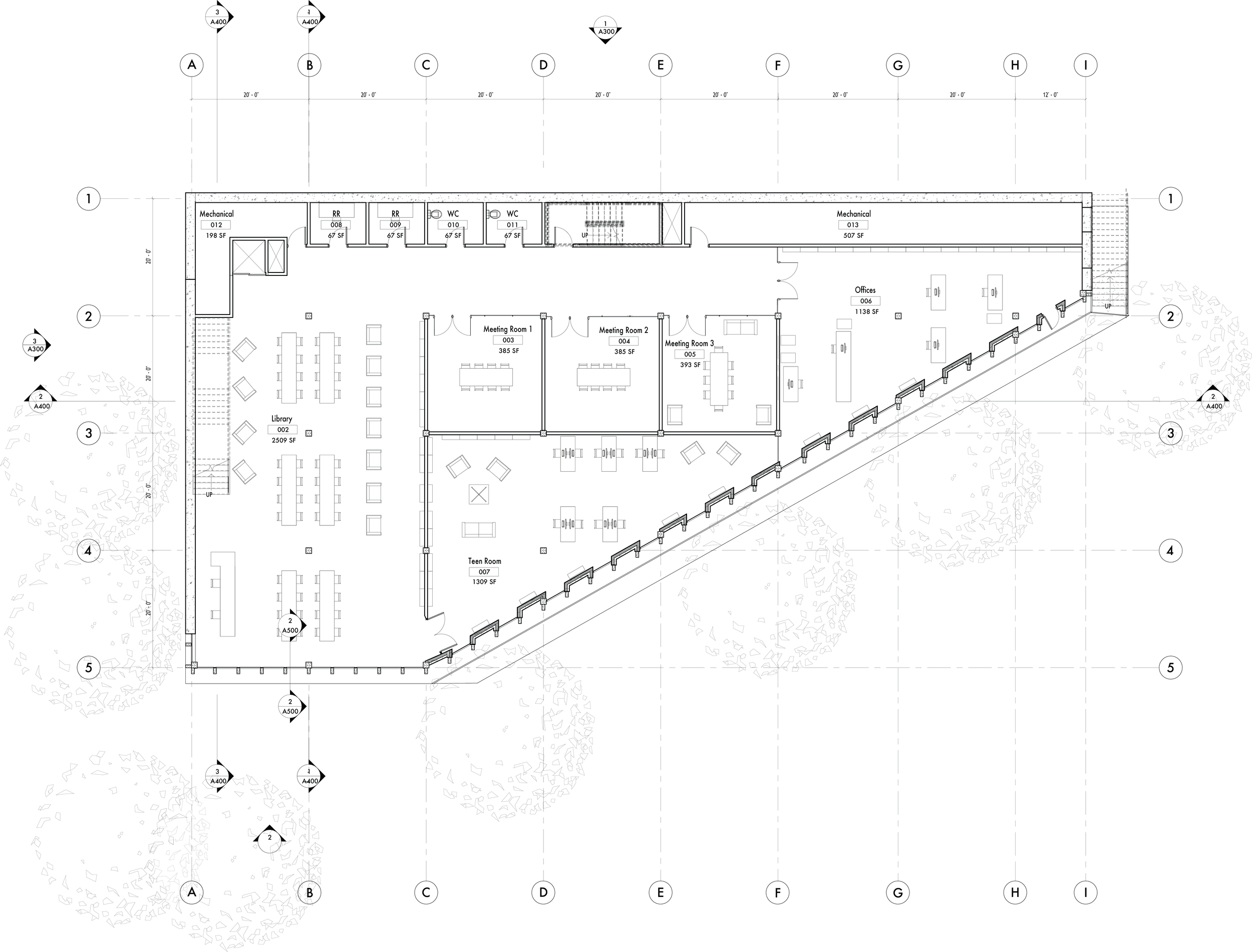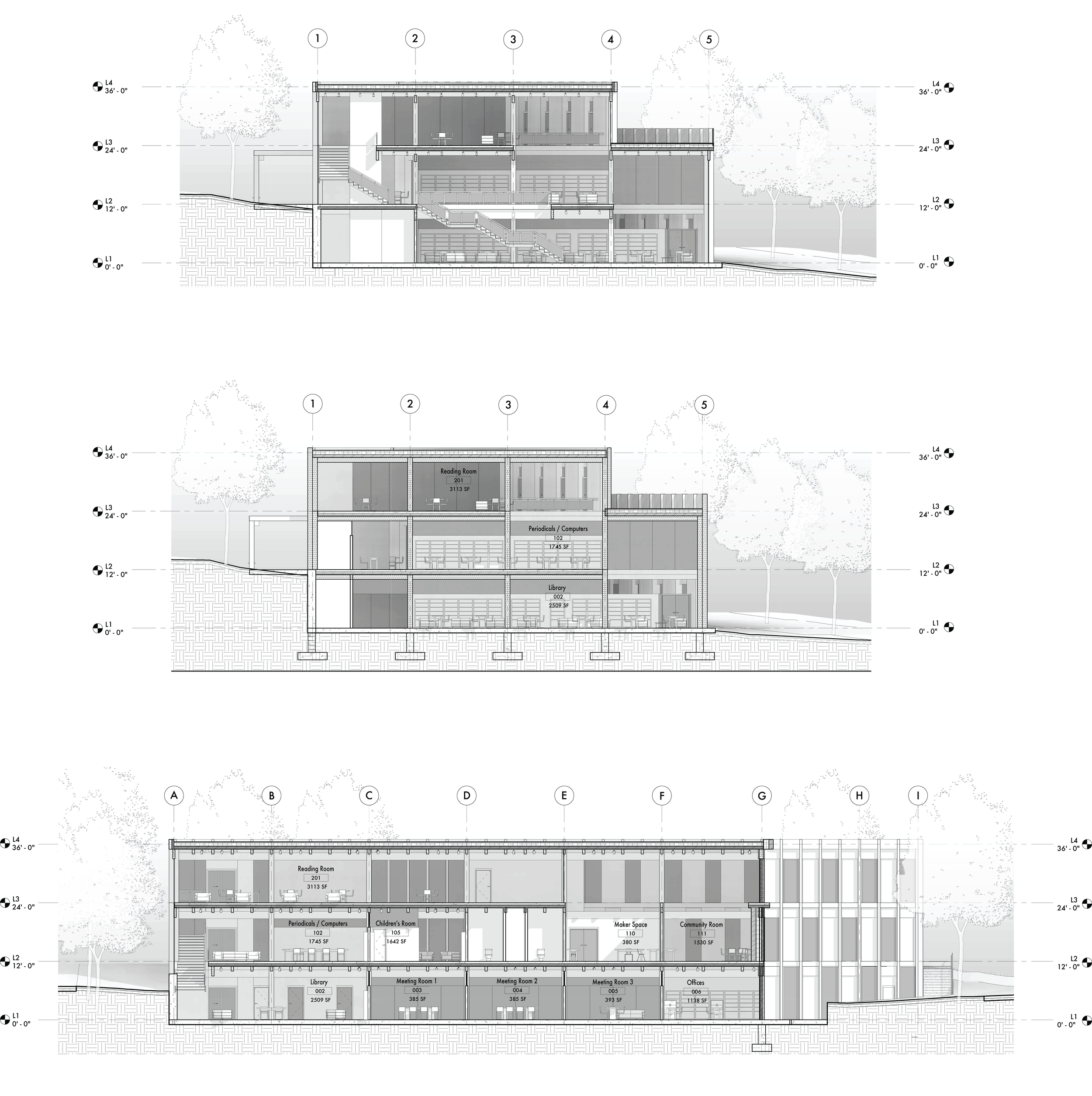 The guiding concept of the library’s design is to provide a central hub of activity and engagement for the neighborhood where all residents feel welcome, comfortable, and inspired to pursue both individual and collective life-enhancing interests and activities. To that end, the architecture of the building is simultaneously grounded in place through its partial immersion into the existing slope of the site while also retaining as much transparency as possible to eliminate perceptual borders that may inhibit community engagement.