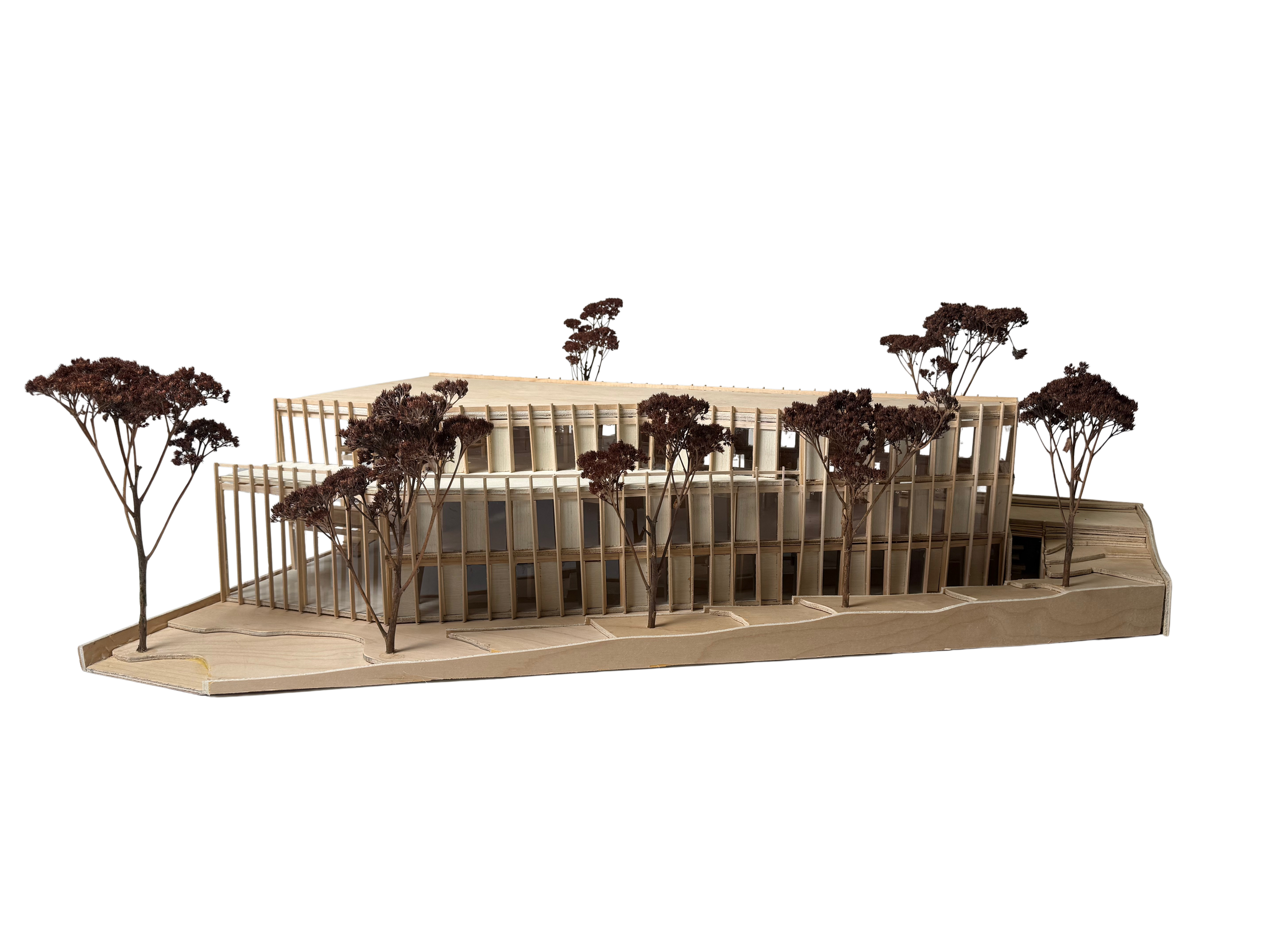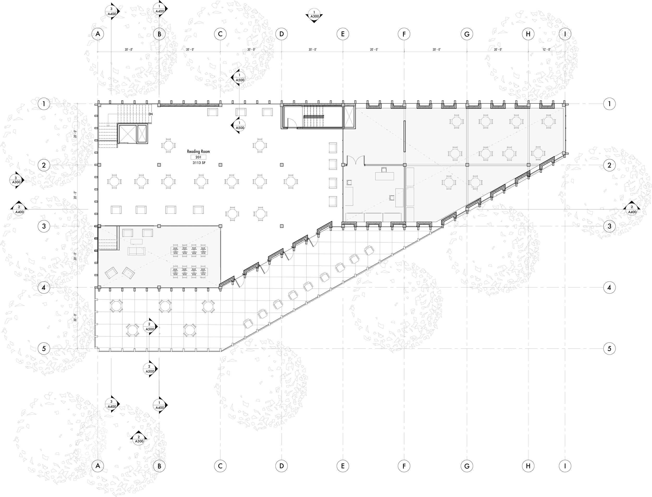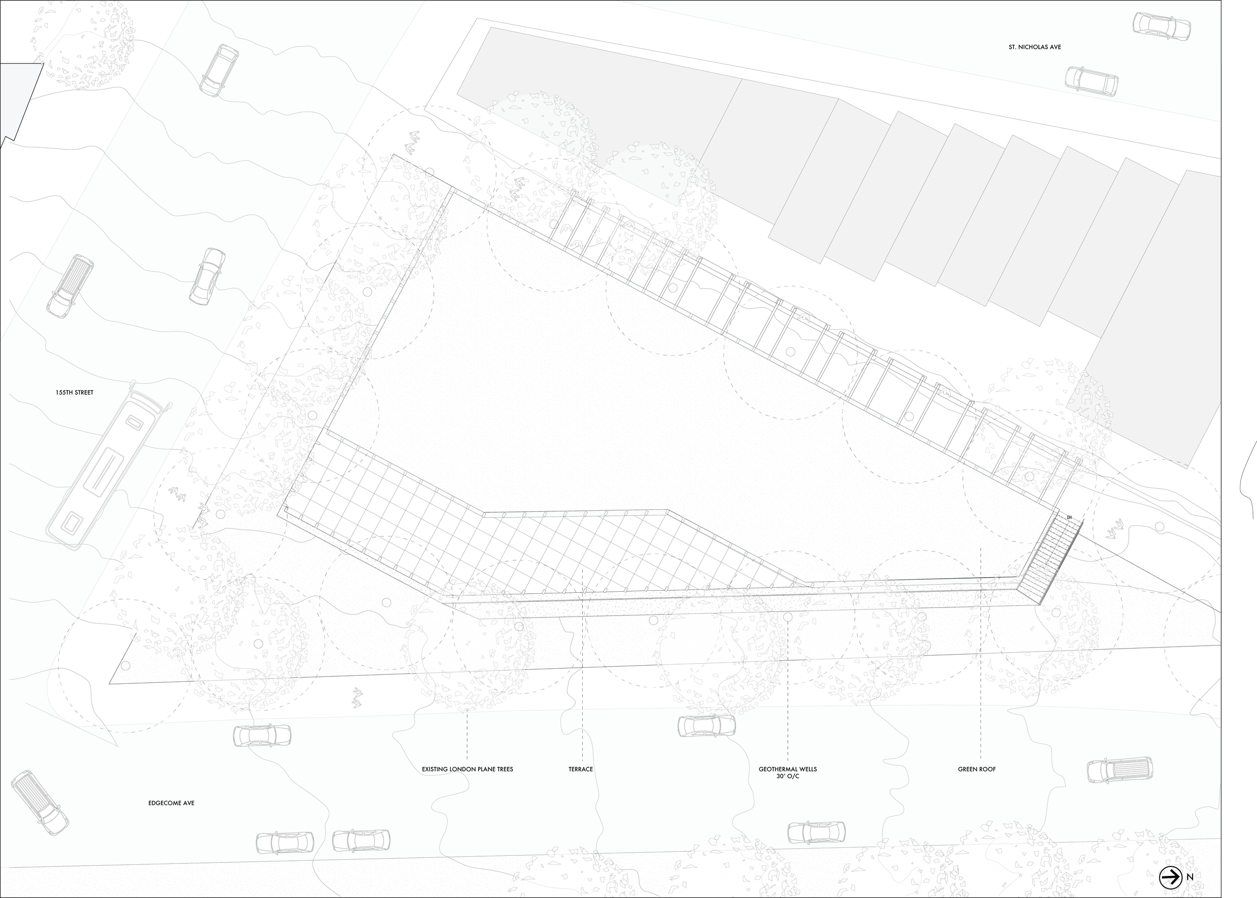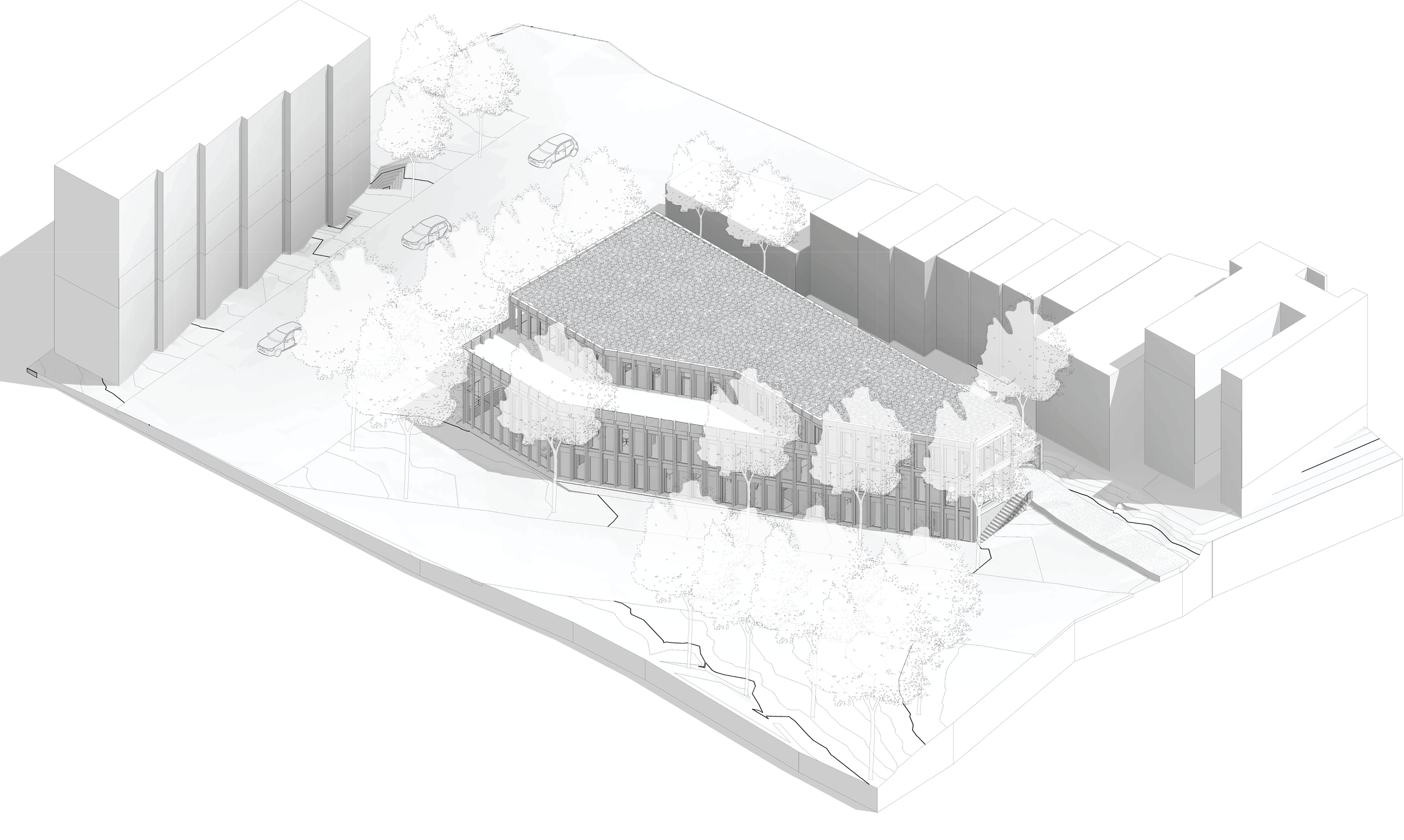 The guiding concept of the library’s design is to provide a central hub of activity and engagement for the neighborhood where all residents feel welcome, comfortable, and inspired to pursue both individual and collective life-enhancing interests and activities. To that end, the architecture of the building is simultaneously grounded in place through its partial immersion into the existing slope of the site while also retaining as much transparency as possible to eliminate perceptual borders that may inhibit community engagement.