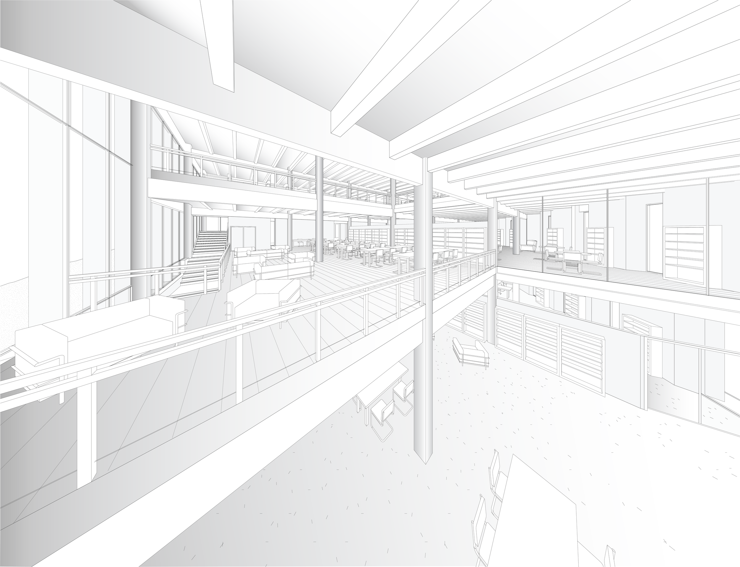 The interior space is arranged into two main sections—the community oriented side and the library side. By offering dedicated space for making and creating on the community side, the notion of the library as a place of solitary learning through reading is expanded to include creative and educational activities that are more communal in nature. The maker space is a place where residents of all ages can gather and interact while the library side maintains the more individualized activities of traditional libraries.